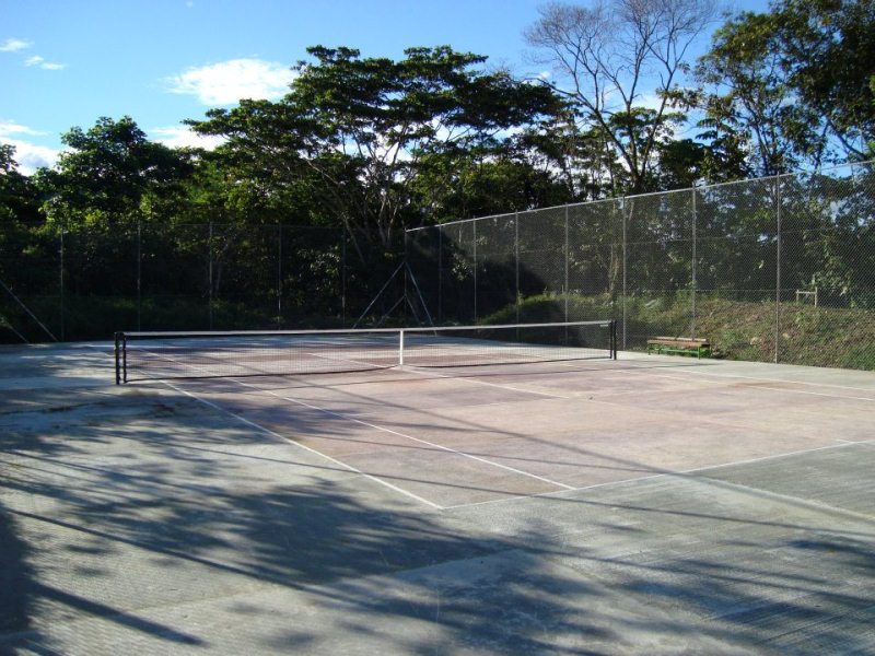 cancha de tenis de ferreconcreto con medidas oficiales y malla profesional, todo encercado de malla eslabonada galvanizada 5m de altura, tiene alumbrado profesional de lámparas Roy Alpha (4 x 1000W), red eléctrica instala, se maneja el alumbrado y timbre de la cancha desde el hotel. - COLUMNA Y PLACA PARA TANQUES DEL AGUA: