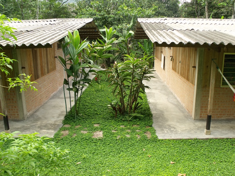 2 CASAS ANEXOS EN EL JARDIN : cada casa tiene un andén techado, cada casa tiene 4 alcobas privadas con baño privado, espacio para 4 hamacas. En total son 8 habitaciones en las 2 casas. Cada baño cuenta con ducha con agua al clima, unidad sanitaria, lavamanos y espejo