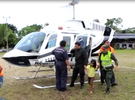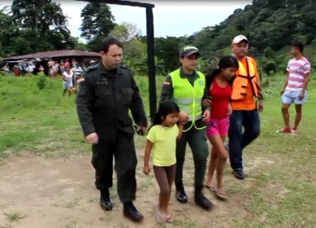 La policía en el municipio de puerto Caicedo, vereda Damasco Vides, adelantó una labor de rescate a través de una operación helicoportada de dos menores de 6 y 13 años de edad, quienes quedaron atrapadas en sus residencias, luego de que le desbordamiento del rio putumayo y san juan acabaran con la vida de su madre y su abuelo, quienes murieron ahogados por la corriente súbita.