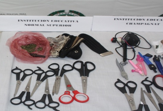 El registro se le efectuó a más de 1500 estudiantes, logrando la incautación de (68) elementos corto punzantes, (01) maquina tatuadora hechiza y (50) dosis de marihuana. Tres de los menores que fueron sorprendidos con los alucinógenos se remitieron para orientación psicológica ante comisaria de familia.
