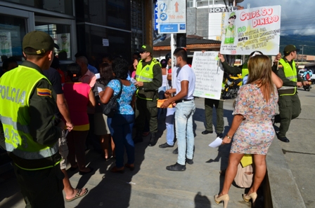 Por medio de volantes, carteleras, mimos y representaciones teatrales realizadas en las entidades financieras, terminales de trasportes y sector comercial, la Policía Nacional continua trabajandoen diferentes campañas, para darle a conocer a los ciudadanos los diferentes delitos de los cuales pueden ser víctimas de los delincuentes, especialmente aquellas personas que son usuarios de las diferentes entidades financieras.