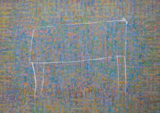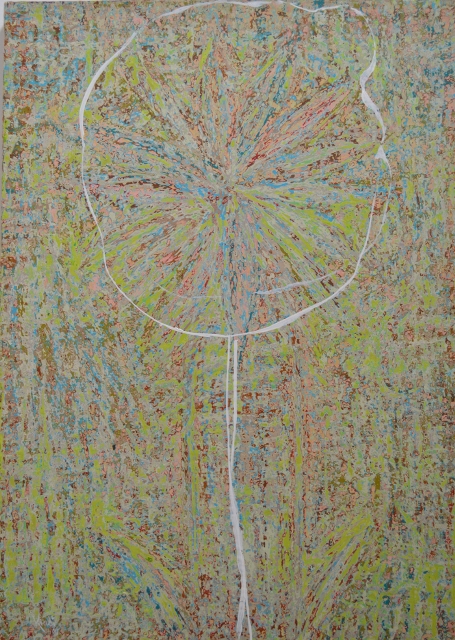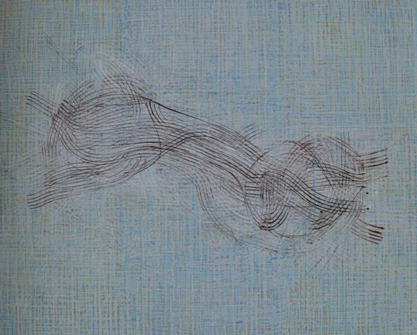 » Ahora esa línea fluida, elegante y precisa que había dibujado sonidos del campo y recuerdos de infancia, se había convertido en unos trazos imprecisos y erráticos cuya razón de ser sólo vine a comprender al enterarme de que no eran líneas de tiza o de pincel, sino líneas producto de una cuerda que el artista pigmentaba y movía como una serpiente sobre el lienzo, las cuales, por supuesto, no seguían tan estrictamente las órdenes de su cerebro. Este experimento era claramente una respuesta a cuestionamientos a cerca de la importancia concedida a la estética en su producción y acerca de la esencia del dibujo.»
