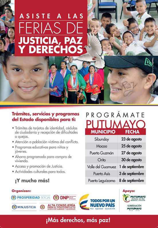Por ello, el SENA Regional Putumayo, se une a la iniciativa y hace parte, de las ferias de justicia, paz y derechos que desde ayer 23 de Agosto y en fechas especificas en las siguientes semanas, estará de tour por el departamento en dónde presentará la oferta institucional, y muestras de logros obtenidos por los aprendices desde el programa de atención a victimas.