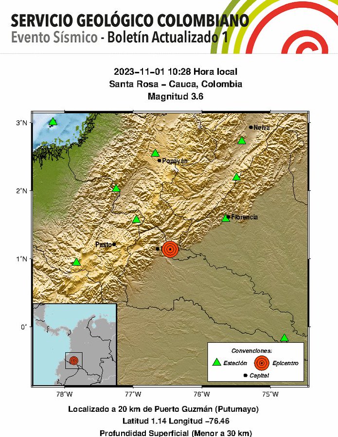 #SismosColombiaSGC Evento Sísmico – Boletín Actualizado 1, 2023-11-01, 10:28 hora local Magnitud 3.6, Profundidad Superficial (Menor a 30 km), Santa Rosa – Cauca, Colombia ¿Sintió este sismo? repórtelo https://sismosentido.sgc.gov.co https://sgc.gov.co/sismos #Temblor #Sismo