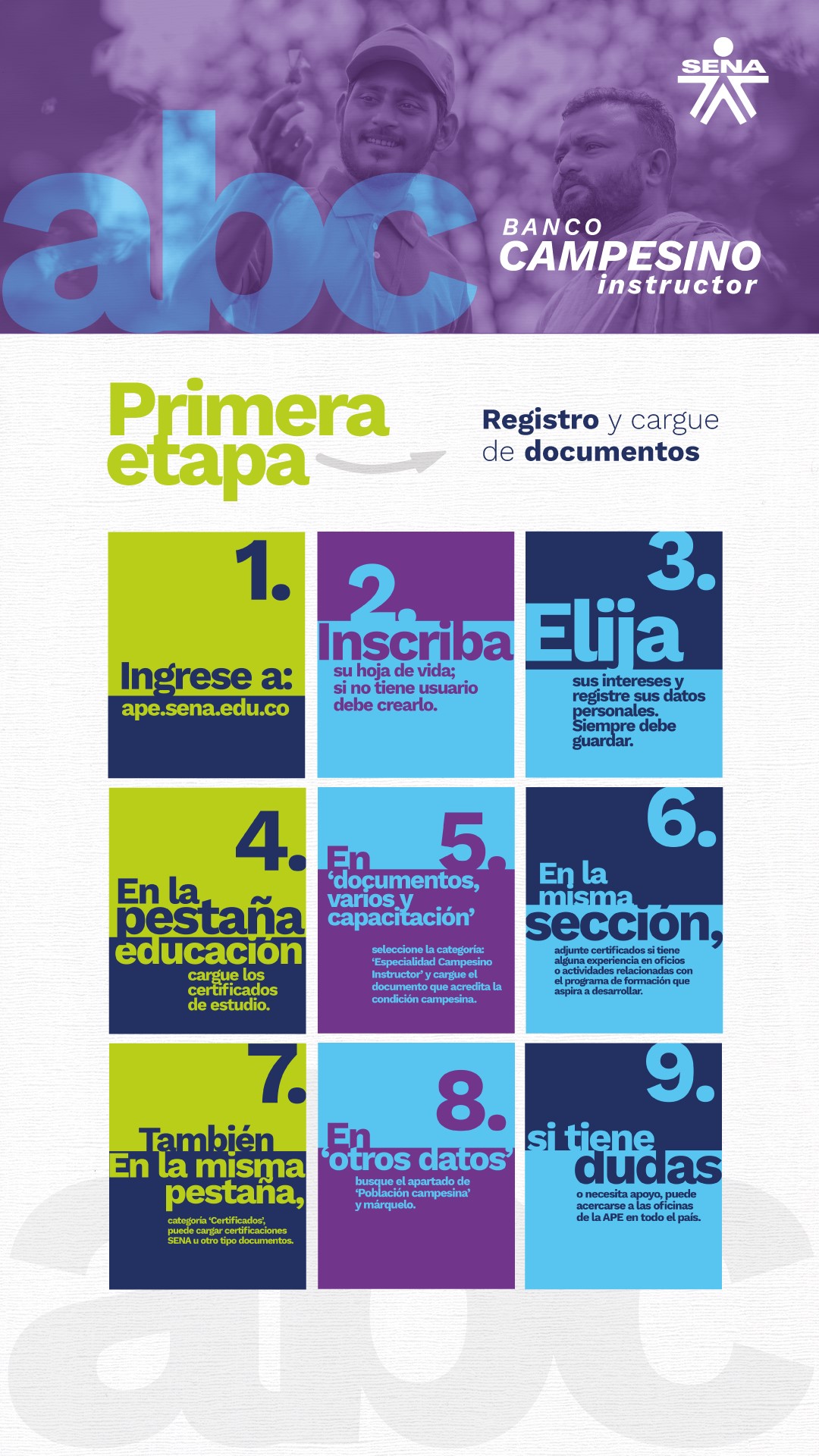 - Los interesados en participar en el Banco Campesino Instructor deben ingresar a la Agencia Pública de Empleo, a través de la página ape.sena.edu.co. Todo hace parte de la estrategia CampeSENA.