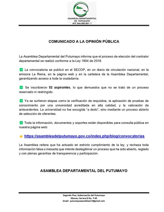 La Asamblea Departamental del Putumayo emitió un comunicado para defender la legalidad y transparencia del proceso de elección del contralor departamental. El comunicado, dirigido a la opinión pública, detalla los pasos seguidos para la elección, asegurando que se realizó conforme a la Ley 1904 de 2018.