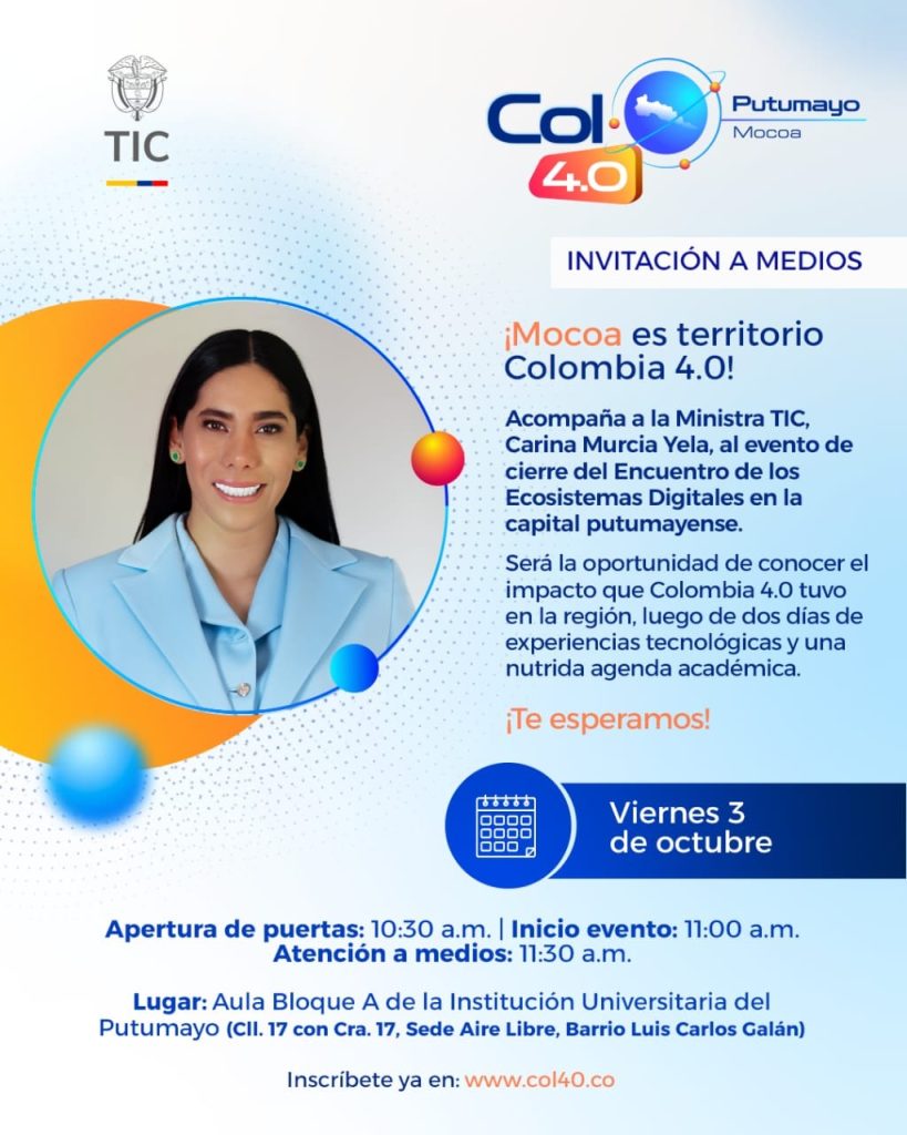 • Clausura de Colombia 4.0 Putumayo: Liderará el evento de cierre de Colombia 4.0 Territorios Digitales, donde entregará reconocimientos a entidades aliadas que han impulsado el desarrollo digital en el departamento.