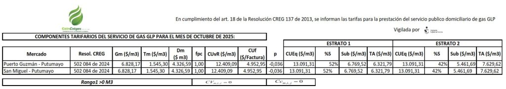 En cumplimiento del artículo 18 de la Resolución CREG 137 de 2013, se informan las tarifas para la prestación del servicio público domiciliario de Gas GLP para los municipio de Puerto Guzmán y San Miguel, en el Departamento del Putumayo