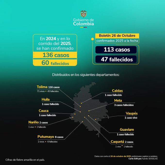 En Colombia, entre 2024 y lo que va corrido de 2025, se han confirmado 136 casos autóctonos y 3 importados de fiebre amarilla, concentrados en 10 departamentos: Tolima (116), Putumayo (8), Meta (3), Caquetá (2), Nariño (2), Vaupés (1), Caldas (1), Cauca (1), Huila (1) y Guaviare (1) (Fuente: BES, INS).