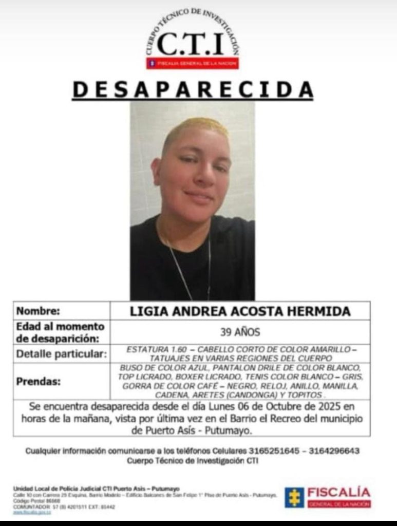 Se encuentra desaparecida desde el lunes 6 de octubre de 2025 en horas de la mañana, vista por última vez en el barrio El Recreo, en Puerto Asís, Putumayo.