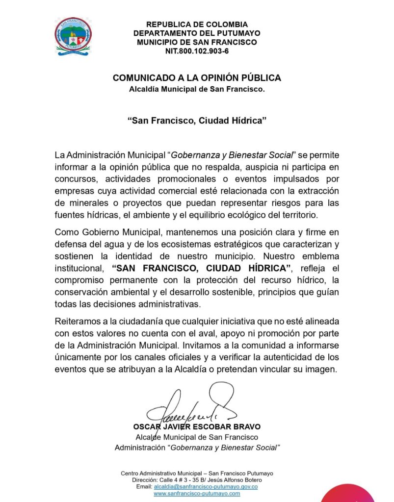 San Francisco, Putumayo – La Administración Municipal de San Francisco, bajo el lema «Gobernanza y Bienestar Social» , ha emitido un Comunicado a la Opinión Pública para fijar su postura institucional frente a actividades comerciales que pongan en riesgo el patrimonio hídrico y ambiental del municipio.