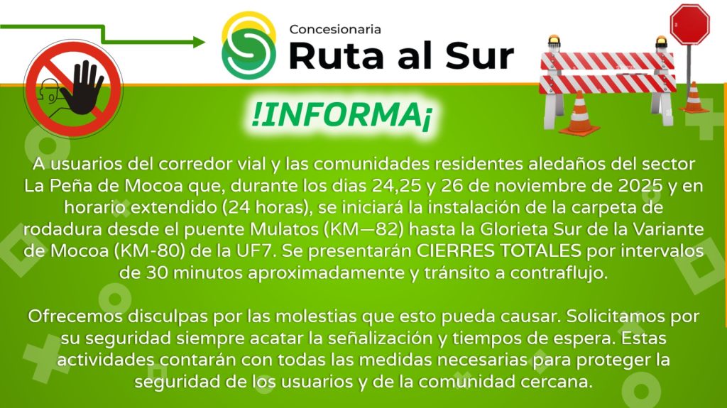 Las autoridades y el equipo de obra hacen un llamado urgente a la ciudadanía para que acaten estrictamente la señalización provisional instalada y sigan las instrucciones de los controladores viales (paleteros). Estas medidas son fundamentales para garantizar la seguridad tanto de los usuarios de la vía como del personal que trabajará día y noche en la zona.