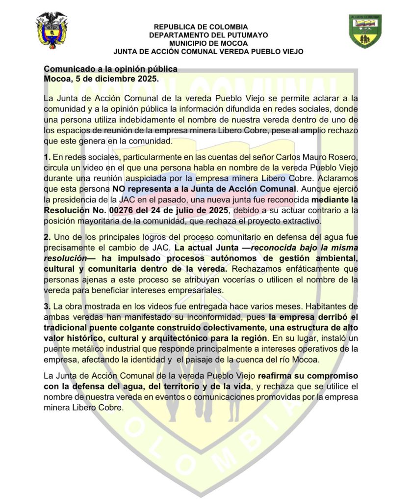 La Junta de Acción Comunal (JAC) de la vereda Pueblo Viejo, en el municipio de Mocoa, Departamento del Putumayo, emitió un comunicado a la opinión pública para aclarar la información difundida en redes sociales sobre una reunión auspiciada por la empresa minera Libero Cobre.