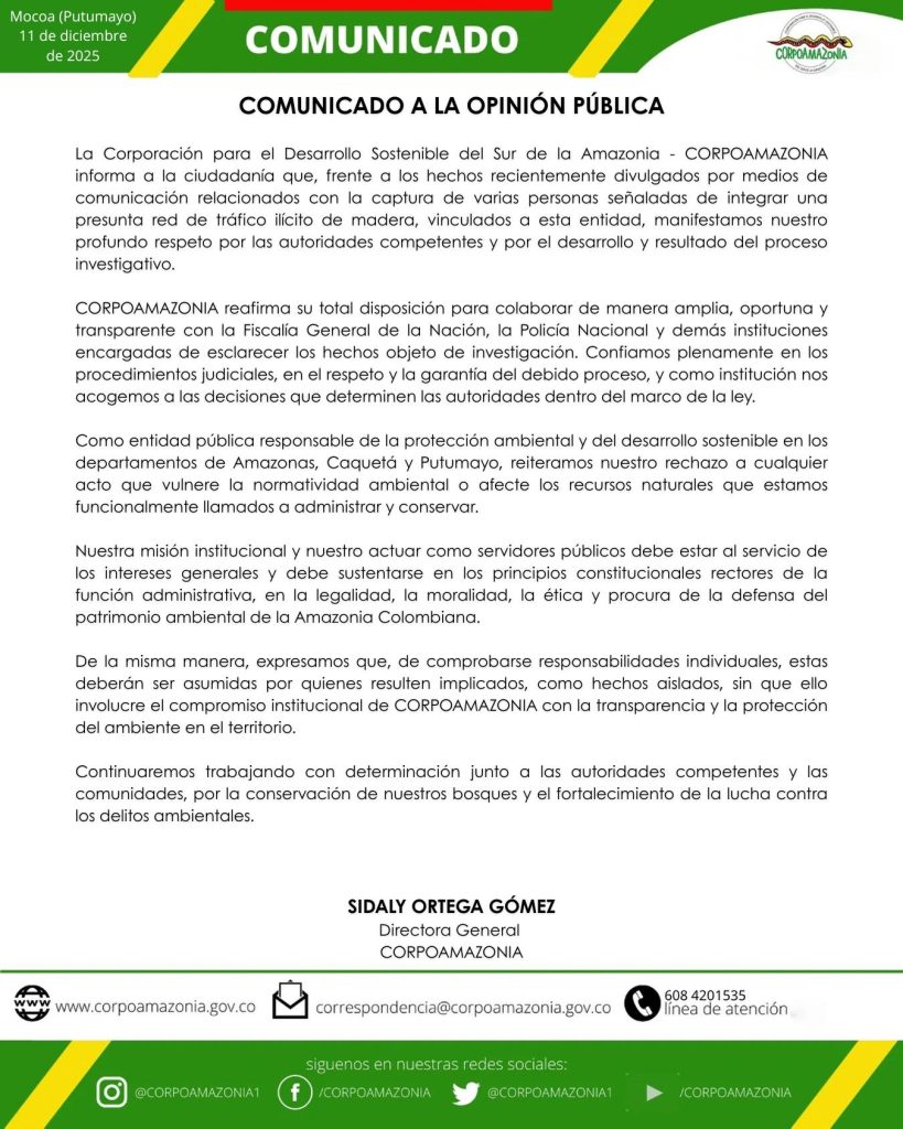 CORPOAMAZONIA reafirmó su total disposición para colaborar de manera «amplia, oportuna y transparente» con la Fiscalía General de la Nación, la Policía Nacional y demás instituciones encargadas de esclarecer los hechos.