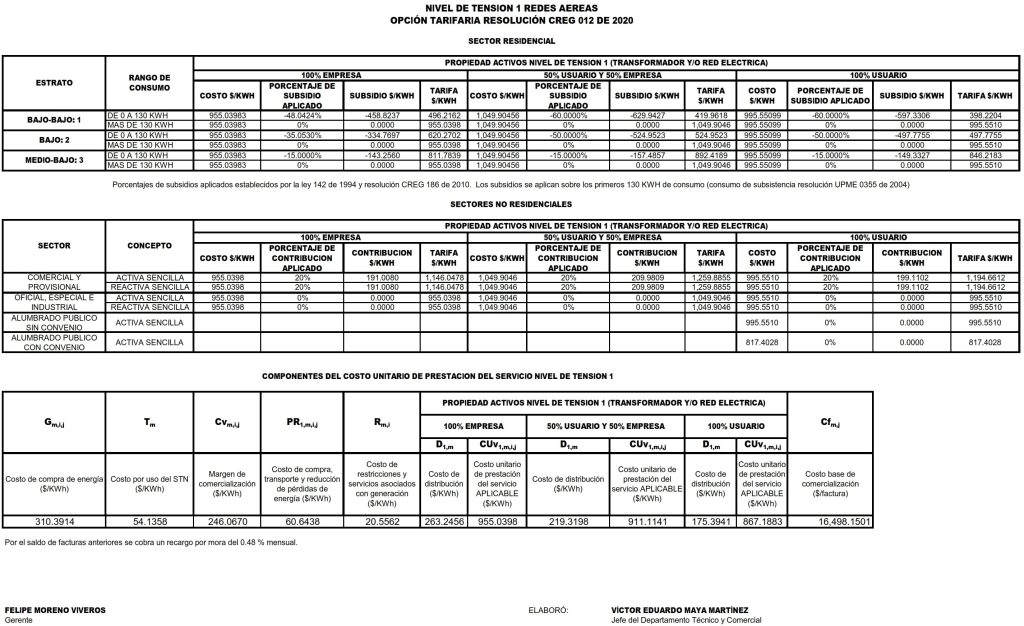 Tarifas calculadas según resoluciones CREG 079/1997, 119/2007, 017/2008, 058/2008, 097/2008, 143/2009, 186/2010, 173/2011, 133/2013, 180/2014, 191/2014, 013/2016, 019/2018, 012/2020, 101 002/2022, 101 029/2023, 105 006/2023, 101 036/2024, circular CREG 015/2010 y decreto 2860 de 2013 del Ministerio de Hacienda