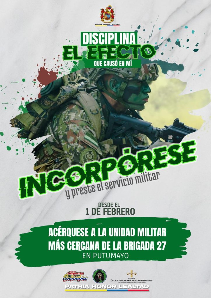 La Vigésima Séptima Brigada del Ejército Nacional informa a los jóvenes colombianos, hombres y mujeres, entre los 18 años y hasta un día antes de cumplir los 24, que a partir del 1 de febrero de 2026 dará inicio a la convocatoria para la inscripción a prestar el servicio militar en las diferentes unidades militares ubicadas en el departamento del Putumayo, con un total de 573 cupos disponibles.
