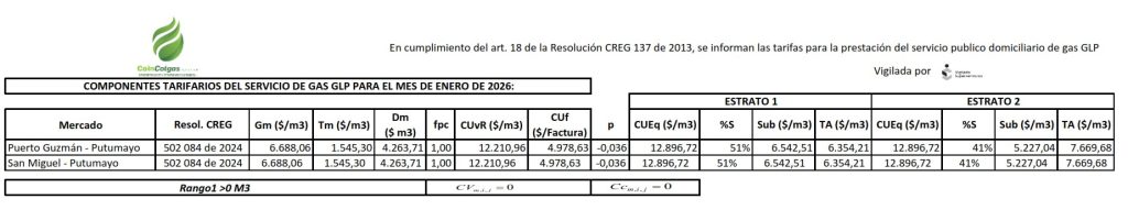 En cumplimiento del artículo 18 de la Resolución CREG 137 de 2013, se informan las tarifas para la prestación del servicio público domiciliario de Gas GLP para los municipio de Puerto Guzmán y San Miguel, en el Departamento del Putumayo