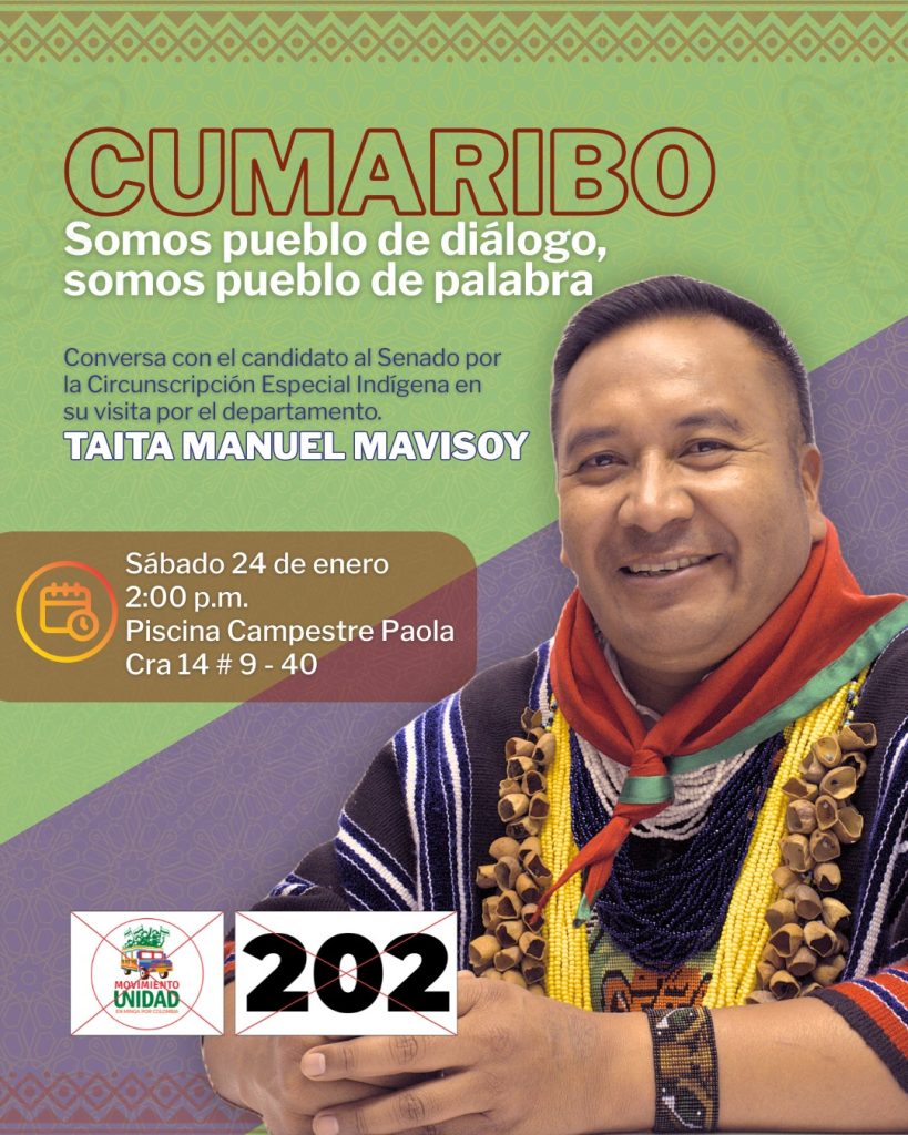 En el marco de su campaña al Senado de la República por la Circunscripción Especial Indígena, el Taita Manuel J. Mavisoy, autoridad indígena y candidato del Movimiento Unidad en Minga por Colombia, estará en el municipio de Cumaribo, Vichada, entre el 23 al 28 de enero, desarrollando un ejercicio de diálogo directo con liderazgos y población del territorio.