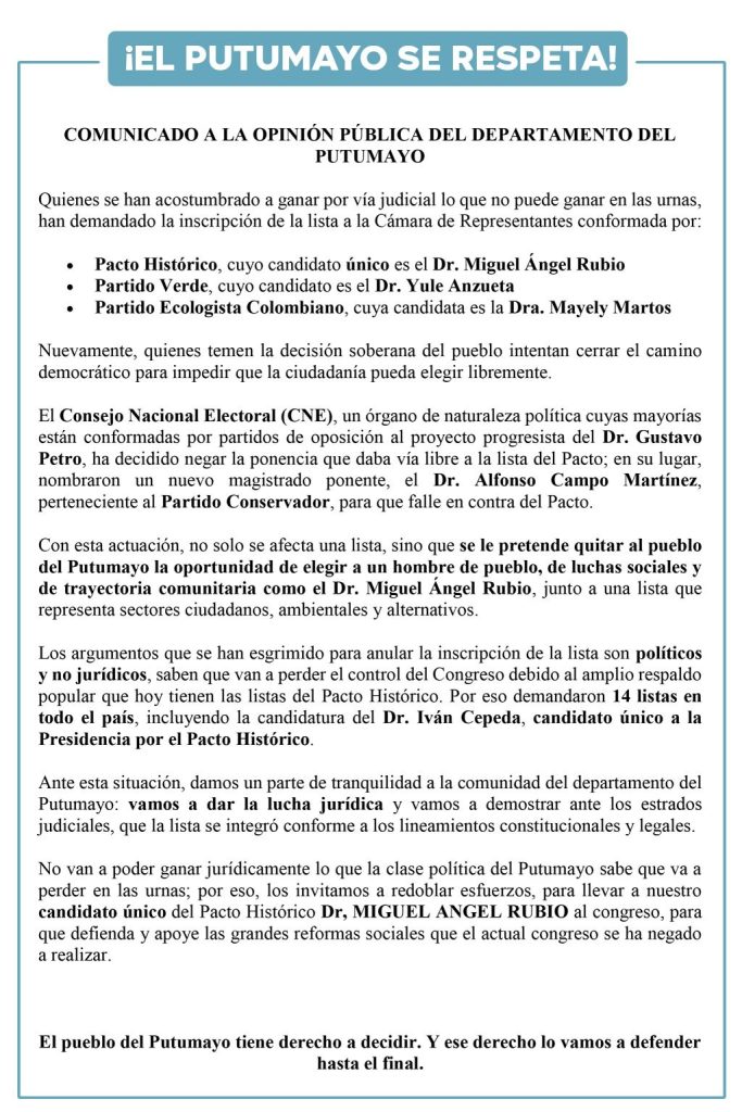 MOCOA – A través de un vehemente comunicado titulado «¡El Putumayo se respeta!», la coalición del Pacto Histórico en el departamento ha denunciado lo que consideran una estrategia judicial para frenar su avance en las urnas. La controversia surge tras la decisión del Consejo Nacional Electoral (CNE) de negar la ponencia que avalaba la inscripción de su lista a la Cámara de Representantes.+1
