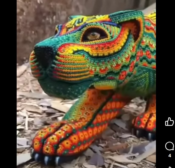 El jaguar mide aproximadamente 𝟳𝟱 𝗰𝗲𝗻𝘁𝗶́𝗺𝗲𝘁𝗿𝗼𝘀 𝗱𝗲 𝗹𝗮𝗿𝗴𝗼 𝘆 𝟯𝟱 𝗱𝗲 𝗮𝗹𝘁𝗼, y está compuesto por cerca de 𝟭𝟭.𝟬𝟬𝟬 𝗽𝗲𝗽𝗶𝘁𝗮𝘀 (𝗰𝗵𝗮𝗾𝘂𝗶𝗿𝗮𝘀), pegadas una a una directamente sobre la madera. Fueron 𝘃𝗮𝗿𝗶𝗼𝘀 𝗺𝗲𝘀𝗲𝘀 𝗱𝗲 𝘁𝗿𝗮𝗯𝗮𝗷𝗼 𝗰𝗼𝗹𝗲𝗰𝘁𝗶𝘃𝗼, donde participaron varios de los cerca de 30 artesanos con los que teje vida con mente, manos y corazón, y donde las obras de mayor complejidad como esta se construyen entre tres, cuatro o más artistas. Aquí no hay ego: 𝗵𝗮𝘆 𝗺𝗶𝗻𝗴𝗮, hay comunidad, hay método ancestral.