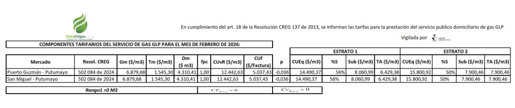 En cumplimiento del artículo 18 de la Resolución CREG 137 de 2013, se informan las tarifas para la prestación del servicio público domiciliario de Gas GLP para los municipio de Puerto Guzmán y San Miguel, en el Departamento del Putumayo
