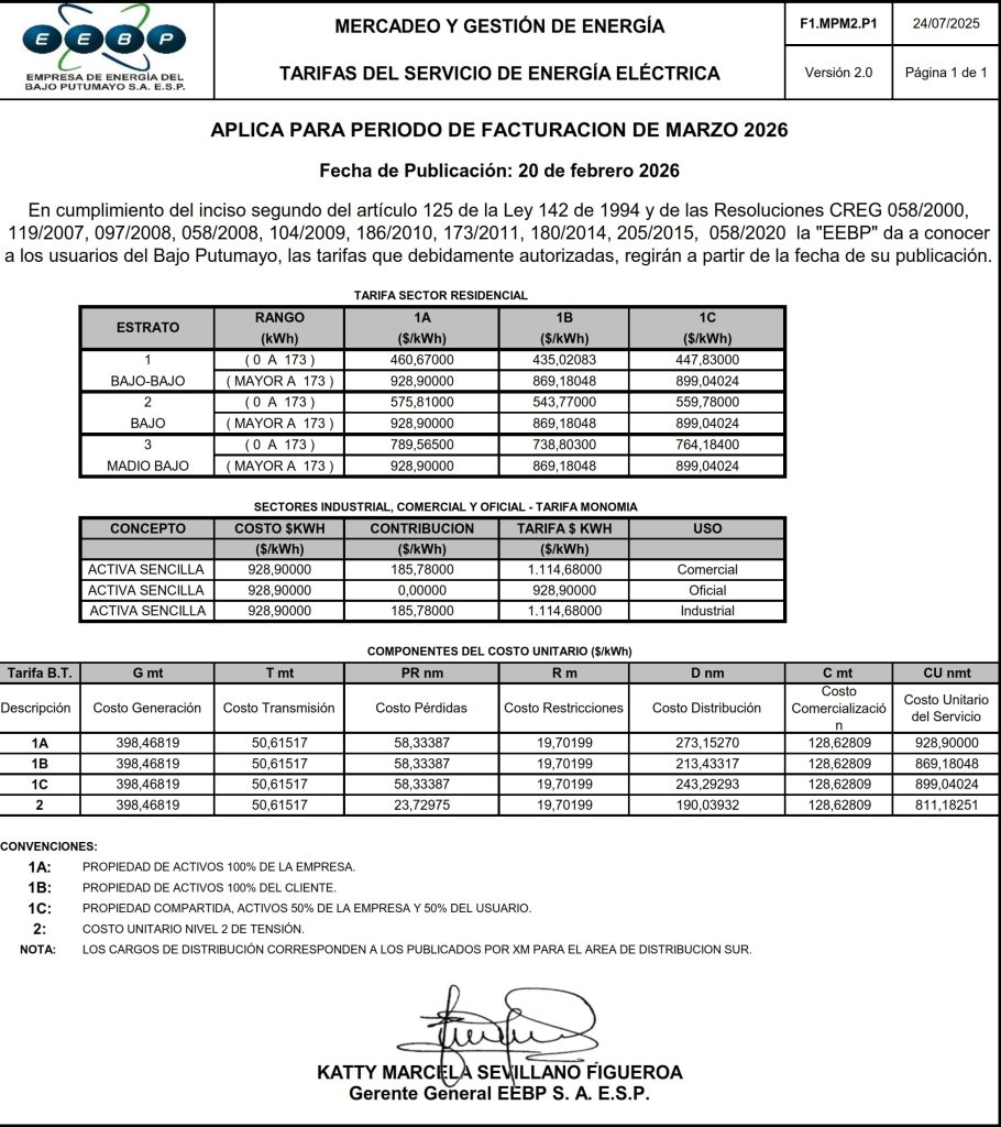 • Empresa de Energía del Bajo Putumayo S.A. – E.S.P. Tarifas del Servicio de Energía Febrero 2026 febrero 19, 2026