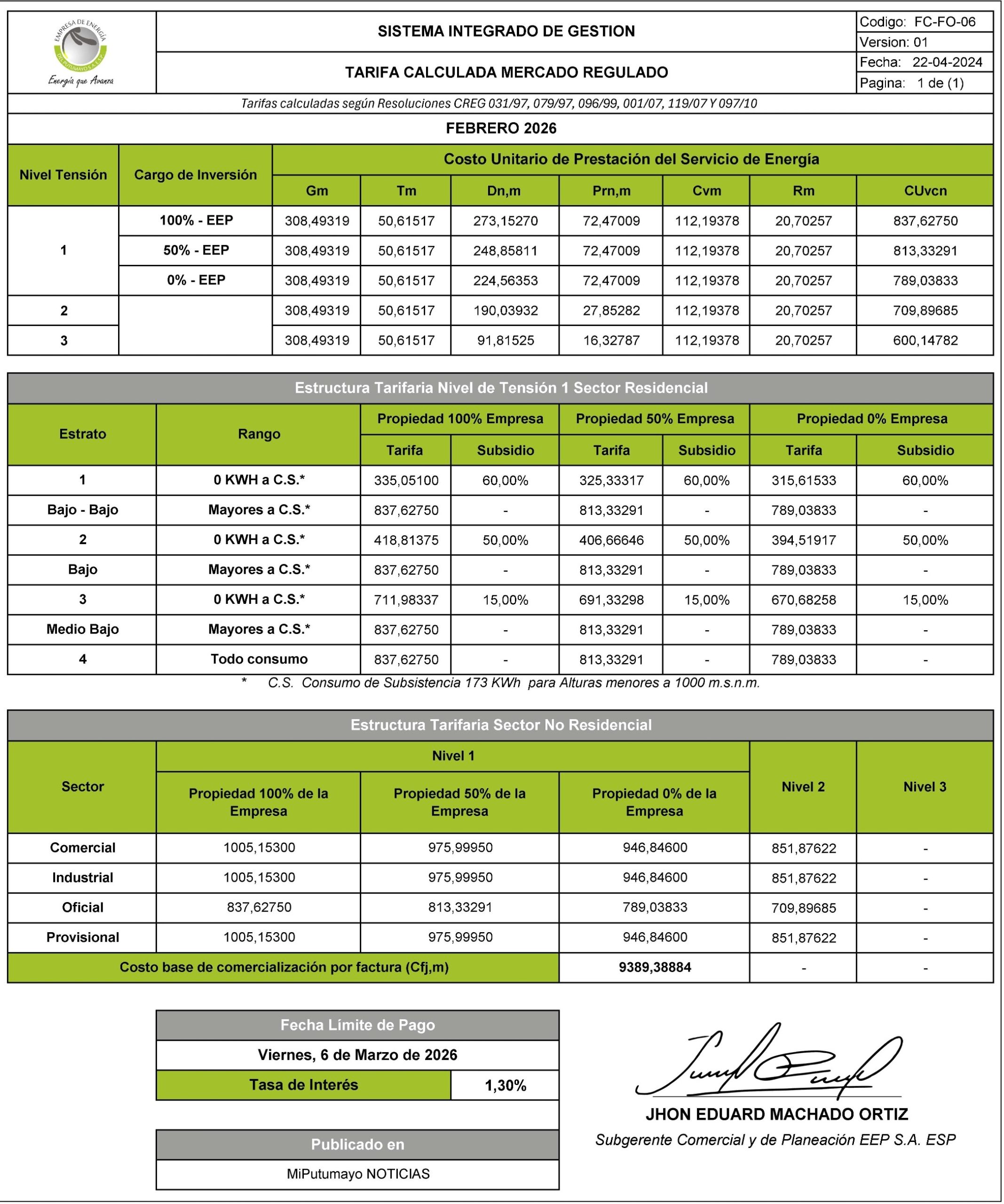 Empresa de Energía del Putumayo – Tarifas calculadas en el mes de Febrero de 2026 para usuarios regulados febrero 20, 2026 por director Fecha de Publicación : Febrero 20 de 2026 MiPutumayo.com.co