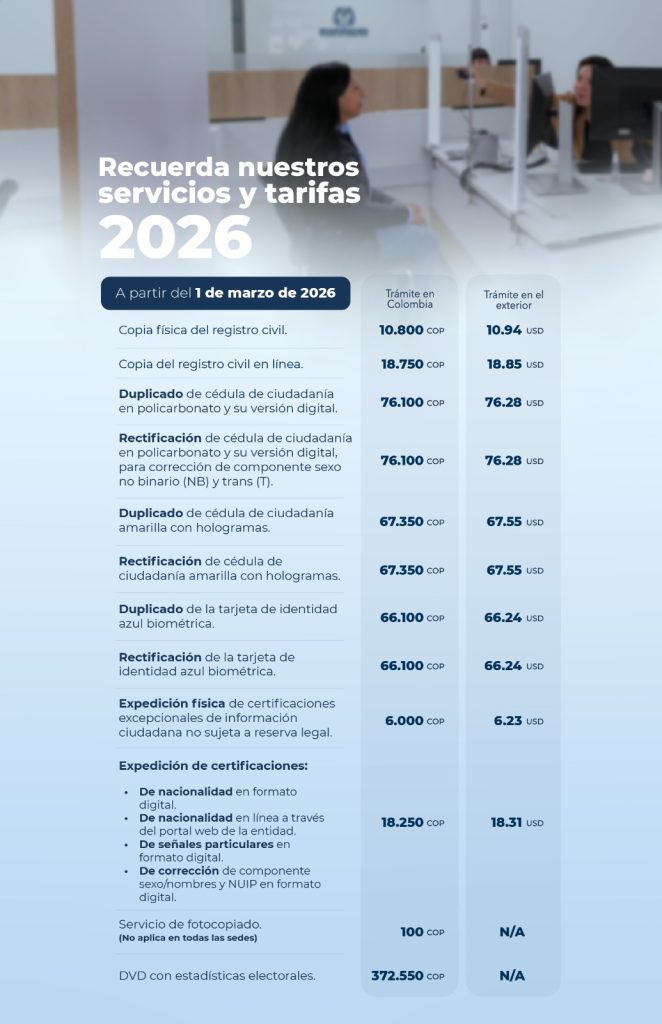 La Registraduría Nacional del Estado Civil informó que, a partir del 1 de marzo, entrarán en vigencia las nuevas tarifas para los diferentes servicios que presta la entidad en todo el territorio nacional.