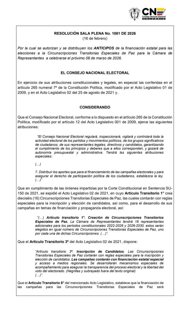 A menos de tres semanas de que los ciudadanos acudan a las urnas el 8 de marzo, el Consejo Nacional Electoral (CNE) dejó en firme las reglas para entregar los anticipos de financiación estatal a las campañas de las Circunscripciones Transitorias Especiales de Paz (Citrep), también conocidas como curules de paz o curules para las víctimas. La medida quedó consignada en la Resolución 1081 de 2026, fechada el 16 de febrero.