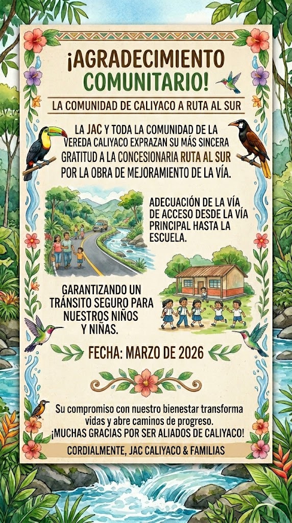 La Junta de Acción Comunal (JAC) de la Vereda Caliyaco, en el municipio de Mocoa, ha expresado formalmente su reconocimiento a la Concesionaria Ruta al Sur por la reciente intervención en su infraestructura vial.