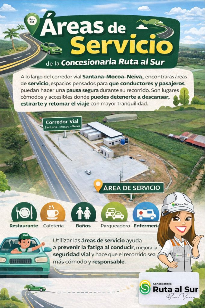 Para quienes transitan por el corredor vial Santana–Mocoa–Neiva, la seguridad y el bienestar durante el viaje son prioridades fundamentales. La Concesionaria Ruta al Sur ha dispuesto áreas de servicio estratégicas, diseñadas como espacios seguros para que tanto conductores como pasajeros realicen pausas activas necesarias en su recorrido.