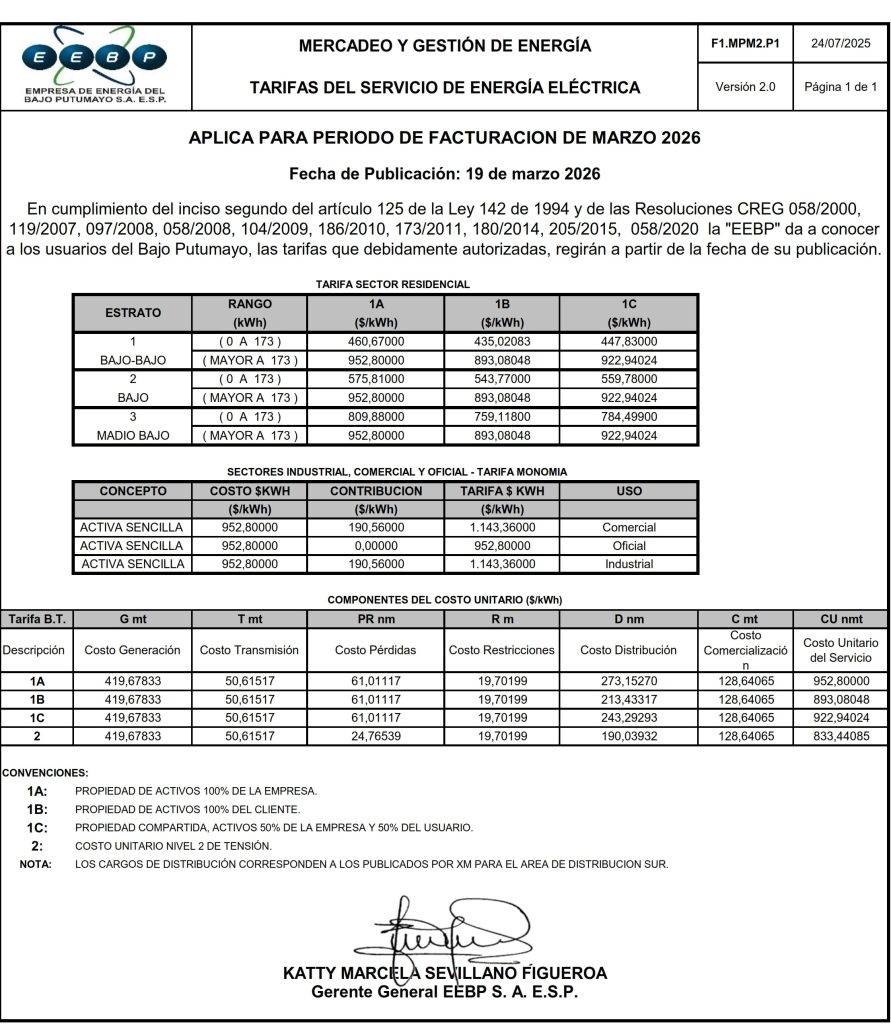 • Empresa de Energía del Bajo Putumayo S.A. – E.S.P. Tarifas del Servicio de Energía Febrero – Ajustadas 2026 marzo 19, 2026