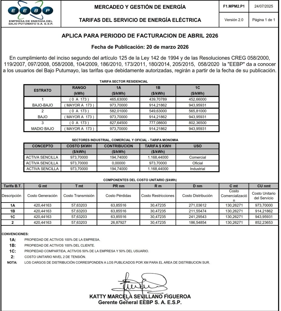 • Empresa de Energía del Bajo Putumayo S.A. – E.S.P. Tarifas del Servicio de Energía Marzo 2026 marzo 20, 2026