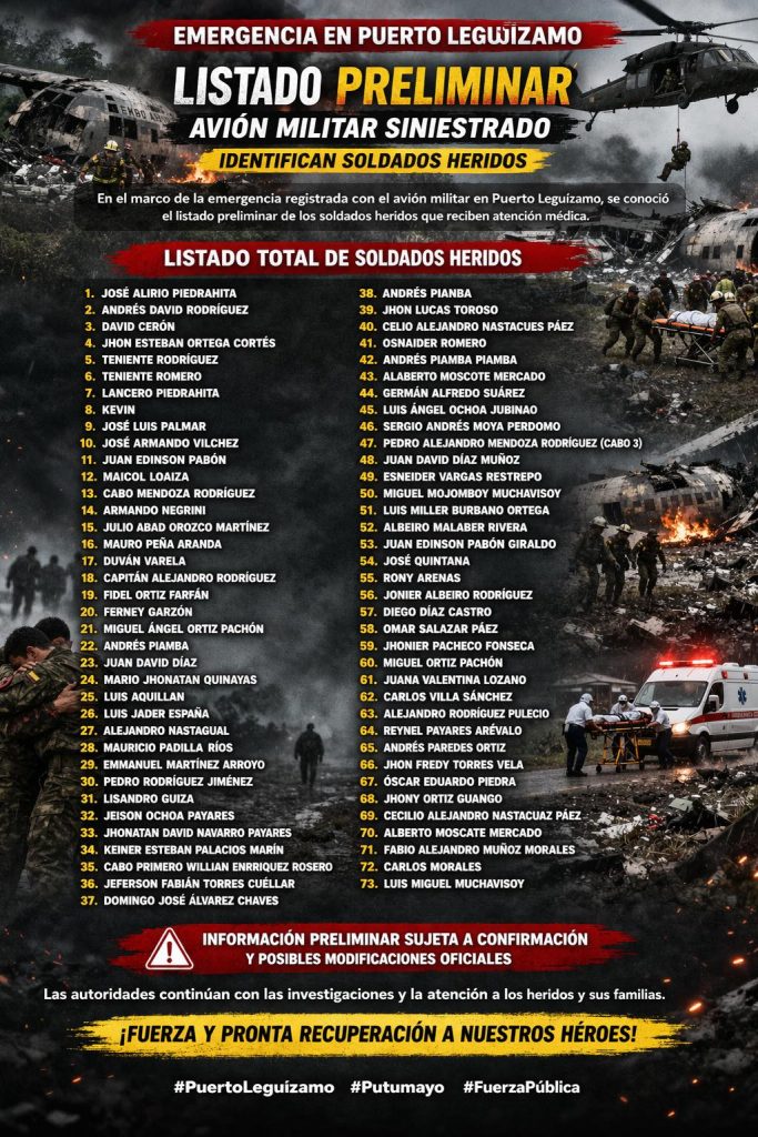 En el marco de la emergencia registrada con el avión militar en Puerto Leguízamo, Putumayo, se conoció un listado preliminar de los soldados que habrían resultado heridos y que actualmente reciben atención médica.