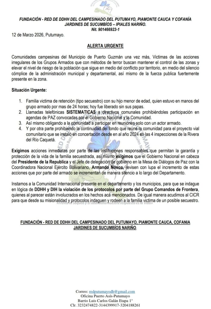 Según Yuri Quintero, vocera de la Red DDH, estos hechos se han vuelto muy frecuentes en la zona rural del municipio de Puerto Guzmán Putumayo, a orillas del río Caquetá, donde los campesinos están en medio de grupos armados ilegales que a pesar de la fuerte presencia militar del estado, mantiene el control absoluto sobre la comunidad.