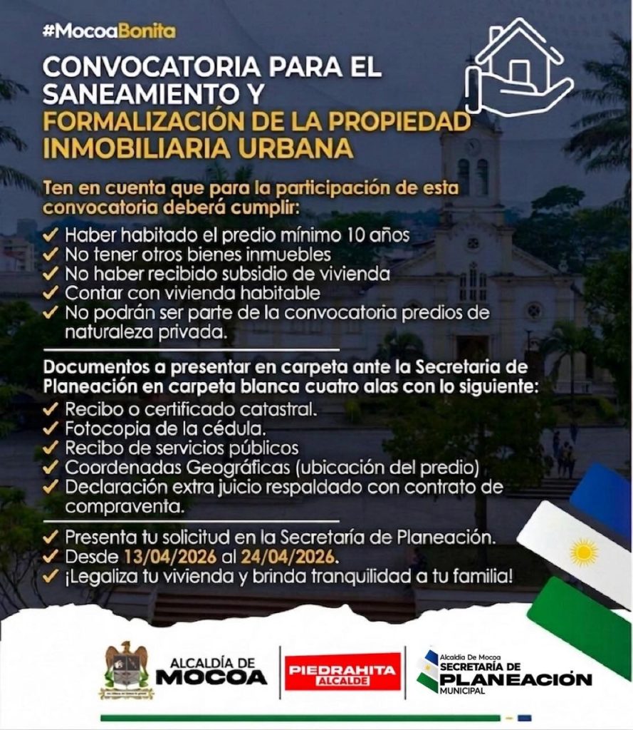 MOCOA. – Con el firme propósito de saldar una deuda histórica con las familias que han vivido durante años en la informalidad, la Alcaldía de Mocoa, bajo la directriz del alcalde Carlos Hugo Piedrahita, ha anunciado la apertura oficial de la convocatoria para el Saneamiento y Formalización de la Propiedad Inmobiliaria Urbana.