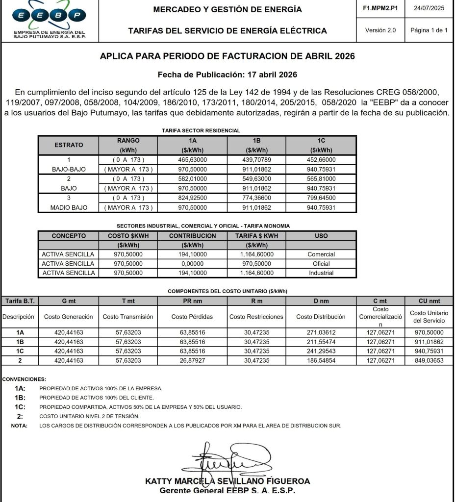 • Empresa de Energía del Bajo Putumayo S.A. – E.S.P. Tarifas del Servicio de Energía Abril 2026 abril 17, 2026