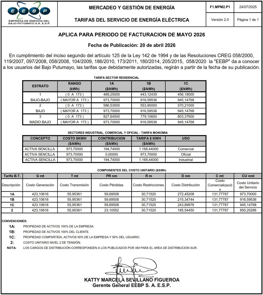 • Empresa de Energía del Bajo Putumayo S.A. – E.S.P. Tarifas del Servicio de Energía Mayo 2026 abril 20, 2026