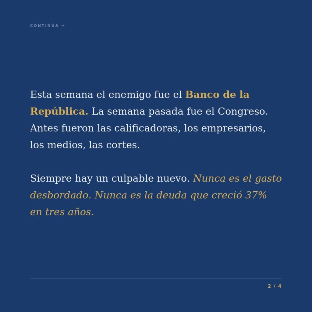 Esta semana el enemigo fue el Banco de la República. La semana pasada fue el Congreso. Antes fueron las calificadoras de riesgo, los empresarios, los medios, las cortes. Siempre hay un culpable nuevo. Nunca es el gasto desbordado. Nunca es la deuda que creció 37% en tres años. Nunca es el déficit primario más alto en 30 años; el que Colombia solo había visto en crisis profundas como 1999 y la pandemia.