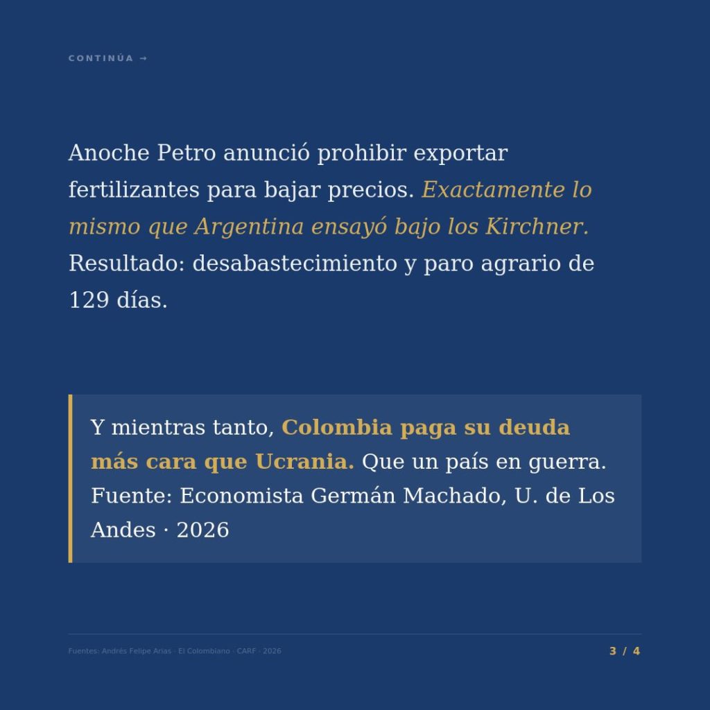 Anoche vimos otro episodio. Petro salió en cadena a responderle al Banco de la República por haber subido las tasas. Anunció que prohibiría exportar fertilizantes para bajar precios internos, receta calcada del progresismo Kirchnerista en Argentina, cuando se ensayó con la soja y que terminó en desabastecimiento y paro agrario. Anunció una cuarta reforma tributaria. La cuarta. Después de que el Congreso le hundió las tres anteriores.