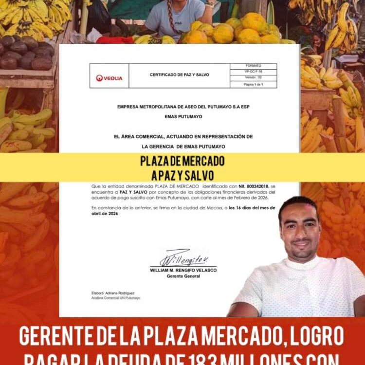 Recibir la administración de la Plaza De Mercado Mocoa Putumayo fue todo un reto, debido a que existían diversos inconvenientes, pero tal vez el problema más grave que existía fue una deuda de más de 183 millones de pesos por concepto de basuras a la empresa Emmas putumayo, hoy gracias al Dios todo poderoso podemos contarles que hemos pagado la totalidad de esta deuda agradecemos de manera especial al señor alcalde Carlos Hugo Piedrahita por depositar la confianza y también a mi equipo de trabajo que me han ayudado a qué este reto sea cumplido