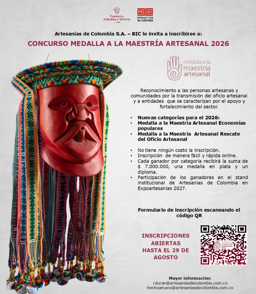 Bogotá, abril de 2026. Artesanías de Colombia S.A. -BIC, abre las inscripciones al Concurso Medalla a la Maestría Artesanal 2026, un reconocimiento que se hace a las personas artesanas y comunidades artesanales por su trabajo artesanal, la preservación de los oficios y la transmisión de los mismos.